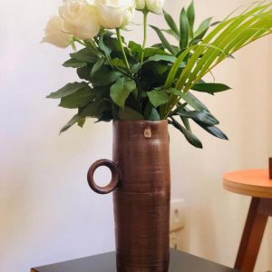 Vaso Cilíndrico com alças, feito em argila preta, com furo no centro para plantar ou fechado para decoração, sem esmalte apenas argila rústica, dimensões 23cm altura x 11cm largura.